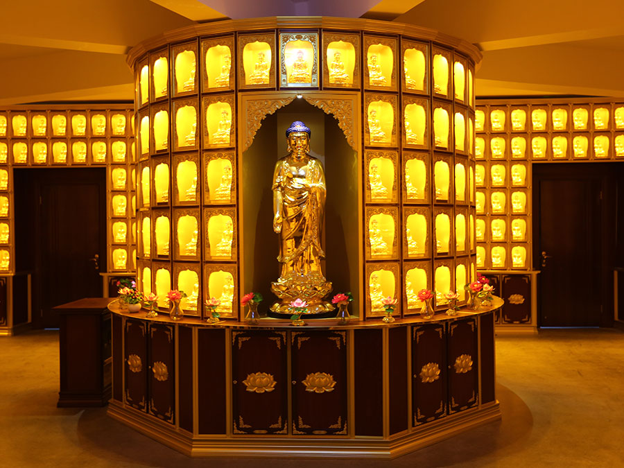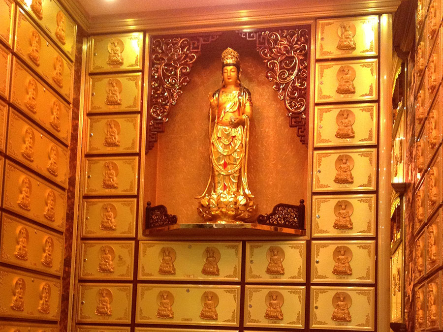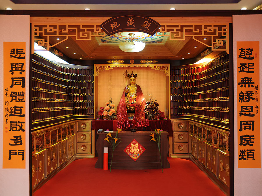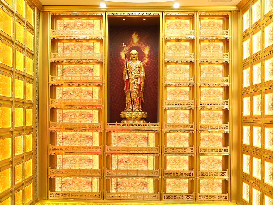 整排存放架為了劃分區(qū)域,在每個區(qū)域靠墻上方,設(shè)置小型佛龕,為了美觀,加上掛落。